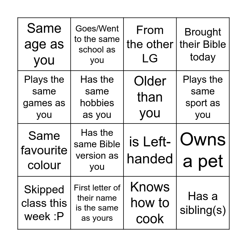 This bingo card has 16 words: First letter of their name is the same as yours, Owns a pet, From the other LG, Same age as you, Same favourite colour, Goes/Went to the same school as you, is Left-handed, Knows how to cook, Plays the same games as you, Has the same hobbies as you, Skipped class this week :P, Brought their Bible today, Has the same Bible version as you, Plays the same sport as you, Older than you and Has a sibling(s).