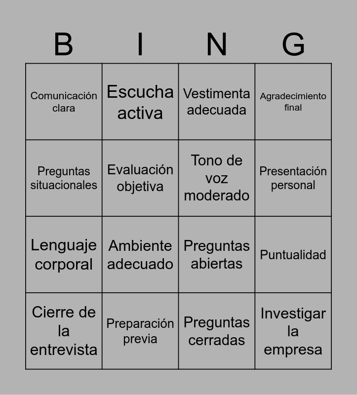 This bingo card has 16 words: Preparación previa, Puntualidad, Vestimenta adecuada, Comunicación clara, Lenguaje corporal, Escucha activa, Preguntas abiertas, Preguntas cerradas, Preguntas situacionales, Evaluación objetiva, Cierre de la entrevista, Agradecimiento final, Ambiente adecuado, Presentación personal, Tono de voz moderado and Investigar la empresa.