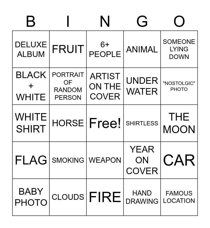 This bingo card has a free space and 24 words: SMOKING, CLOUDS, ARTIST ON THE COVER, BABY PHOTO, SOMEONE LYING DOWN, DELUXE ALBUM, BLACK + WHITE, FRUIT, SHIRTLESS, WEAPON, UNDER WATER, WHITE SHIRT, YEAR ON COVER, CAR, PORTRAIT OF RANDOM PERSON, HAND DRAWING, THE MOON, 6+ PEOPLE, "NOSTOLGIC" PHOTO, HORSE, FAMOUS LOCATION, FLAG, ANIMAL and FIRE.