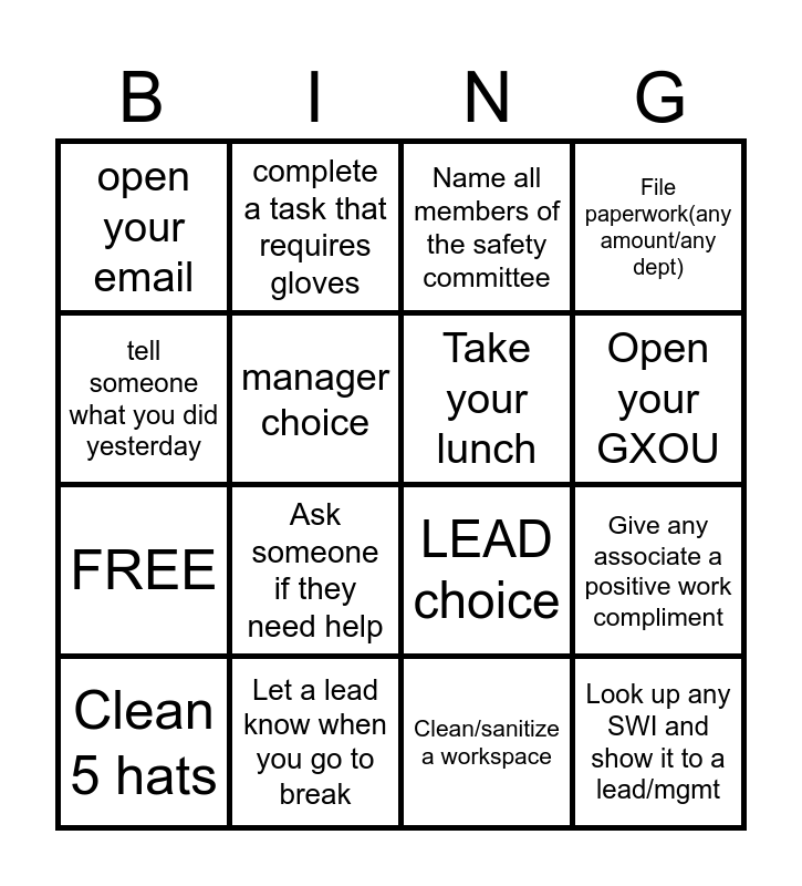 This bingo card has 28 words: RTZ completed, Complete a safety observation, Clean/sanitize a workspace, locate a fire extinguisher(tell a lead/mgmt member where it is), tell someone what you did yesterday, complete a task that requires gloves, Name all members of the safety committee, Give any associate a positive work compliment, FREE, Let a lead know when you go to break, Log-in to a RF gun, File paperwork(any amount/any dept), sweep an aisle, Have your gloves on you, Ensure at least one SAAG board is on a tv, Tell someone the HALO rule, Help a lead/mgmt with a task, manager choice, LEAD choice, Look up any SWI and show it to a lead/mgmt, open your email, Give a shout-out at tier, Pick up a piece of trash, Open your GXOU, Clean 5 hats, Ask someone if they need help, Take your lunch and Greet a member of security.
