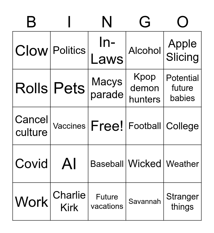 This bingo card has a free space and 24 words: AI, Charlie Kirk, Macys parade, Work, Apple Slicing, Clow, Rolls, Politics, Football, Baseball, Kpop demon hunters, Cancel culture, Wicked, Weather, Pets, Savannah, College, In-Laws, Potential future babies, Vaccines, Stranger things, Covid, Alcohol and Future vacations.