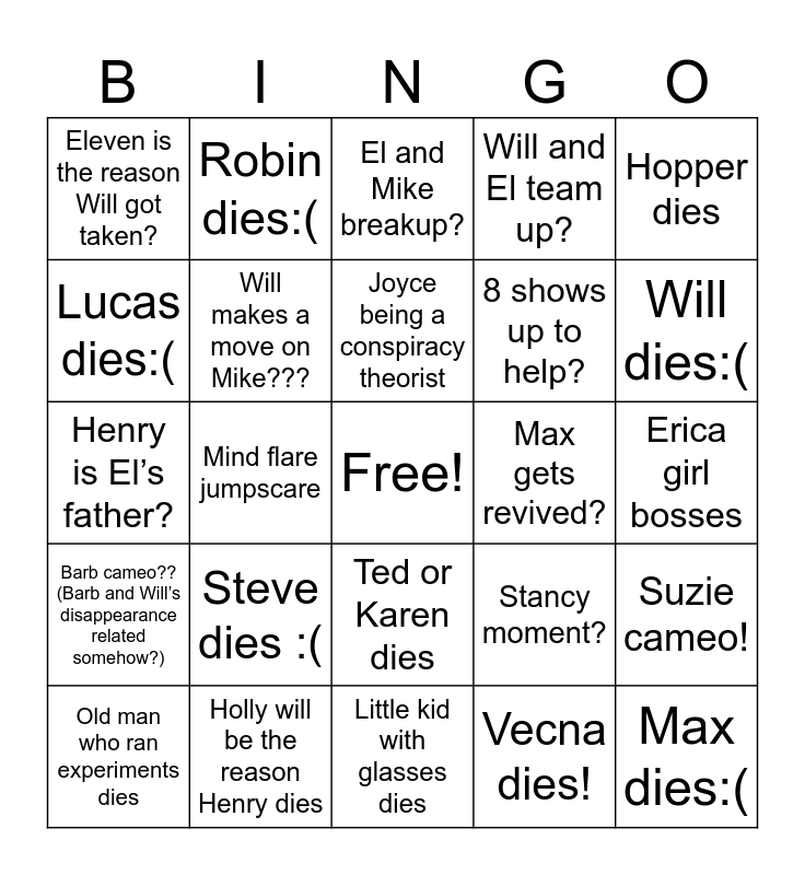 This bingo card has a free space and 24 words: Steve dies :(, Holly will be the reason Henry dies, Joyce being a conspiracy theorist, Old man who ran experiments dies, Hopper dies, Eleven is the reason Will got taken?, Lucas dies:(, Robin dies:(, Max gets revived?, Ted or Karen dies, 8 shows up to help?, Henry is El’s father?, Stancy moment?, Suzie cameo!, Will makes a move on Mike???, Vecna dies!, Erica girl bosses, El and Mike breakup?, Will dies:(, Mind flare jumpscare, Max dies:(, Barb cameo?? (Barb and Will’s disappearance related somehow?), Will and El team up? and Little kid with glasses dies.