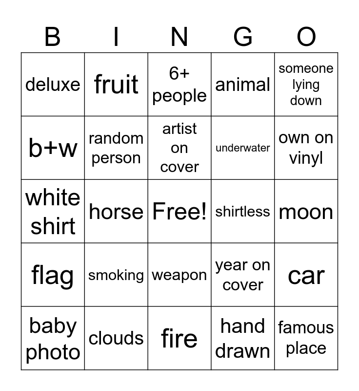 This bingo card has a free space and 24 words: smoking, clouds, artist on cover, baby photo, someone lying down, deluxe, b+w, fruit, shirtless, weapon, underwater, white shirt, year on cover, car, random person, hand drawn, moon, 6+ people, own on vinyl, horse, famous place, flag, animal and fire.