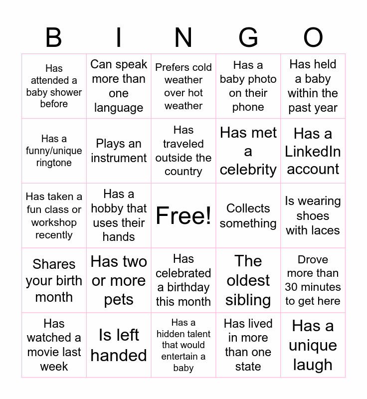 This bingo card has a free space and 24 words: Has two or more pets, Is left handed, Has traveled outside the country, Has watched a movie last week, Has held a baby within the past year, Has attended a baby shower before, Has a funny/unique ringtone, Can speak more than one language, Collects something, Has celebrated a birthday this month, Has met a celebrity, Has taken a fun class or workshop recently, The oldest sibling, Drove more than 30 minutes to get here, Plays an instrument, Has lived in more than one state, Is wearing shoes with laces, Prefers cold weather over hot weather, Has a LinkedIn account, Has a hobby that uses their hands, Has a unique laugh, Shares your birth month, Has a baby photo on their phone and Has a hidden talent that would entertain a baby.