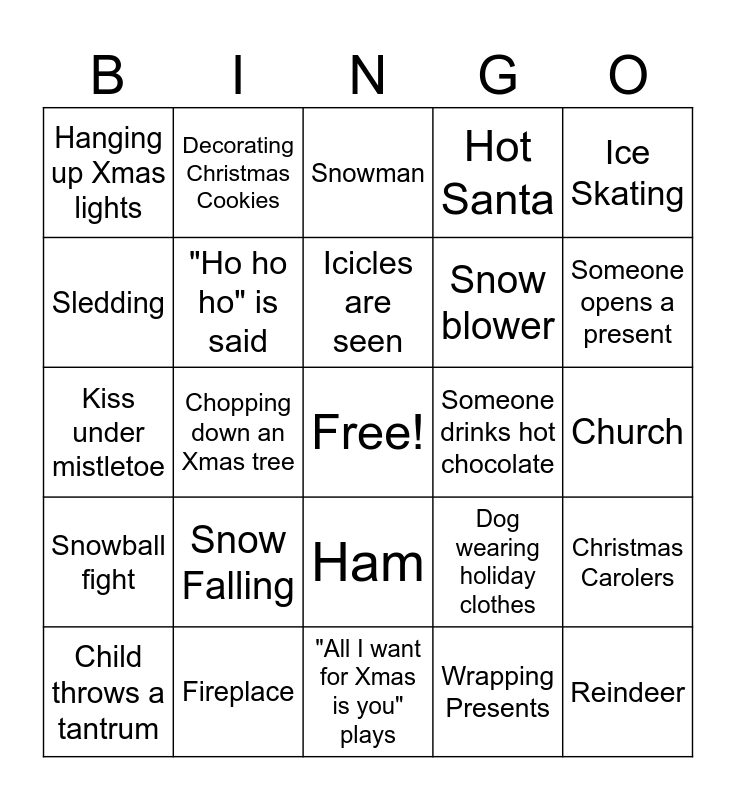 This bingo card has a free space and 24 words: Snow Falling, Fireplace, Icicles are seen, Child throws a tantrum, Ice Skating, Hanging up Xmas lights, Sledding, Decorating Christmas Cookies, Someone drinks hot chocolate, Ham, Snow blower, Kiss under mistletoe, Dog wearing holiday clothes, Christmas Carolers, "Ho ho ho" is said, Wrapping Presents, Church, Snowman, Someone opens a present, Chopping down an Xmas tree, Reindeer, Snowball fight, Hot Santa and "All I want for Xmas is you" plays.