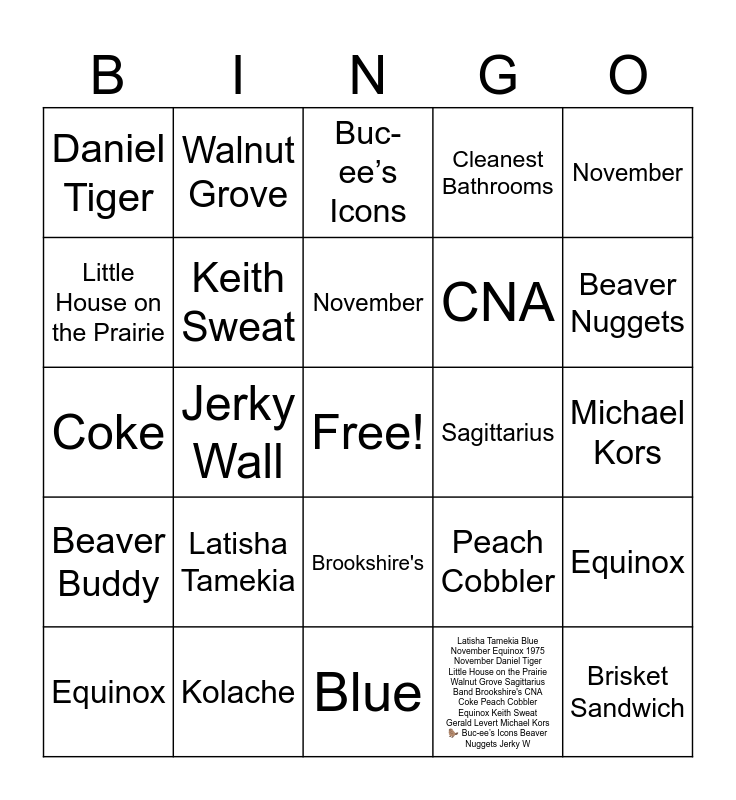 This bingo card has a free space and 25 words: Latisha Tamekia, Blue, November, Equinox, November, Daniel Tiger, Little House on the Prairie, Walnut Grove, Sagittarius, Brookshire's, CNA, Coke, Peach Cobbler, Equinox, Keith Sweat, Gerald Levert, Michael Kors, Buc-ee’s Icons, Beaver Nuggets, Jerky Wall, Brisket Sandwich, Kolache, Beaver Buddy, Cleanest Bathrooms and Latisha Tamekia Blue November Equinox 1975 November Daniel Tiger Little House on the Prairie Walnut Grove Sagittarius Band Brookshire's CNA Coke Peach Cobbler Equinox Keith Sweat Gerald Levert Michael Kors 🦫 Buc-ee’s Icons Beaver Nuggets Jerky W.