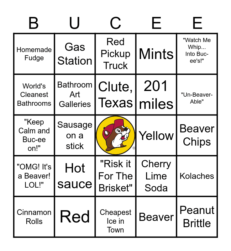 This bingo card has a free space and 47 words: Fresh Pastries, Peanut Brittle, "Fresh Hot Brisket on the board", Cheapest Ice in Town, Hot sauce, Buc-ee's hot sauce, Gas Station, Buc-ee's shirt, World's Cleanest Bathrooms, Pecan Pies, Bathroom Art Galleries, Mints, Kolaches, Cherry Lime Soda, Howdy, World Famous Jerky Wall, Clute, Texas, Yellow, Candied Pecans, "Watch Me Whip... Into Buc-ee's!", Sausage on a stick, Beaver, Homemade Fudge, 201 miles, Snack Cups, "Un-Beaver-Able", Cinnamon Rolls, Stuffed Buc-ee, "Risk it For The Brisket", "OMG! It's a Beaver! LOL!", "Yee-Haw!", Banana pudding, 24/7, Brisket Sandwiches, Home of the Beaver nuggets, Red, Beaver Chips, Tacos and Burritos, buc-ee's popcorn, World's Longest Car Wash, 1982, Red Pickup Truck, "Keep Calm and Buc-ee on!", Dried Fruit, 45 locations, "Beaver Believer" and "Where The Beaver Never Sleeps".