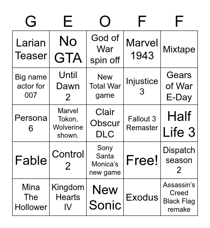 This bingo card has 25 words: Control 2, New Sonic, New Total War game, Mina The Hollower, Mixtape, Larian Teaser, Big name actor for 007, No GTA, Fallout 3 Remaster, Sony Santa Monica’s new game, Injustice 3, Persona 6, Free!, Dispatch season 2, Until Dawn 2, Assassin’s Creed Black Flag remake, Half Life 3, God of War spin off, Gears of War E-Day, Marvel Tokon, Wolverine shown., Clair Obscur DLC, Kingdom Hearts IV, Fable, Marvel 1943 and Exodus.