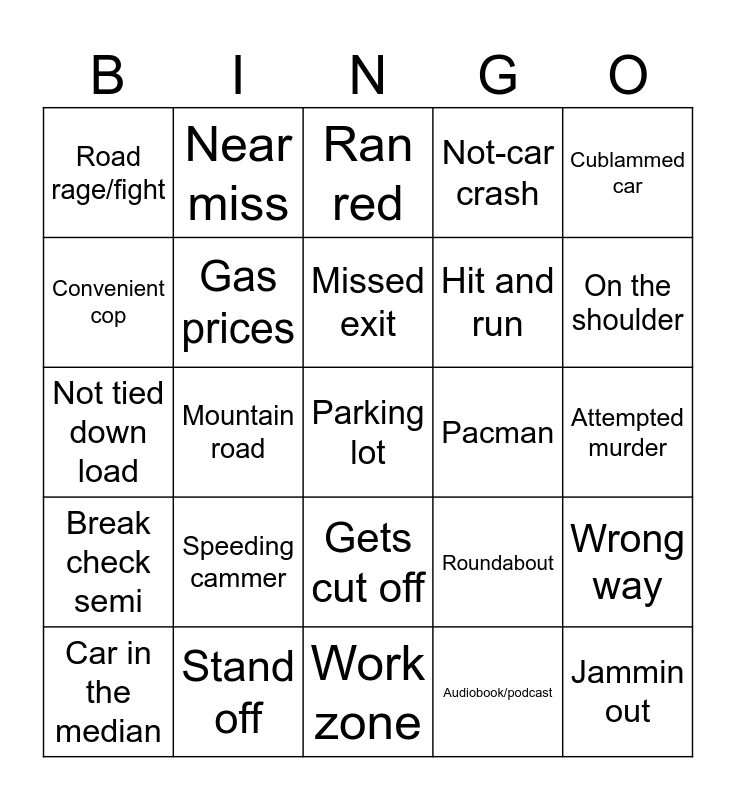 This bingo card has a free space and 29 words: Car in the median, Paired idiots/racers, Mountain road, Fishtailing, Road rage/fight, Ran red, Gas prices, Speeding cammer, Pacman, Stand off, Attempted murder, Jammin out, Work zone, Audiobook/podcast, On the shoulder, Crying, Gets cut off, Break check semi, Cublammed car, Not tied down load, Roundabout, Spin out, Hit and run, Convenient cop, Not-car crash, Near miss, Wrong way, Missed exit and Lost tire.
