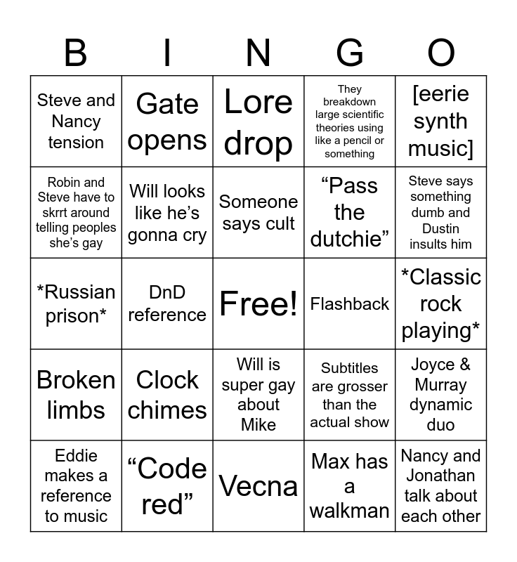 This bingo card has a free space and 24 words: Clock chimes, “Code red”, Someone says cult, Eddie makes a reference to music, [eerie synth music], Steve and Nancy tension, Robin and Steve have to skrrt around telling peoples she’s gay, Gate opens, Flashback, Will is super gay about Mike, “Pass the dutchie”, *Russian prison*, Subtitles are grosser than the actual show, Joyce & Murray dynamic duo, Will looks like he’s gonna cry, Max has a walkman, *Classic rock playing*, Lore drop, Steve says something dumb and Dustin insults him, DnD reference, Nancy and Jonathan talk about each other, Broken limbs, They breakdown large scientific theories using like a pencil or something and Vecna.
