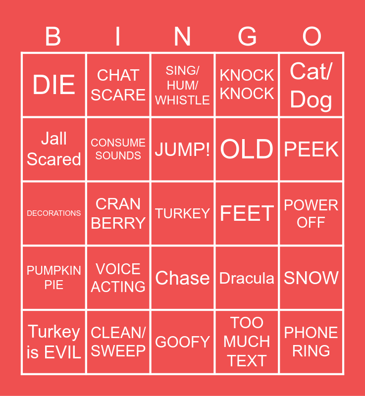 This bingo card has a free space and 24 words: VOICE ACTING, CLEAN/ SWEEP, JUMP!, Turkey is EVIL, Cat/ Dog, DIE, Jall Scared, CHAT SCARE, FEET, Chase, OLD, DECORATIONS, Dracula, SNOW, CONSUME SOUNDS, TOO MUCH TEXT, POWER OFF, SING/ HUM/ WHISTLE, PEEK, CRAN BERRY, PHONE RING, PUMPKIN PIE, KNOCK KNOCK and GOOFY.