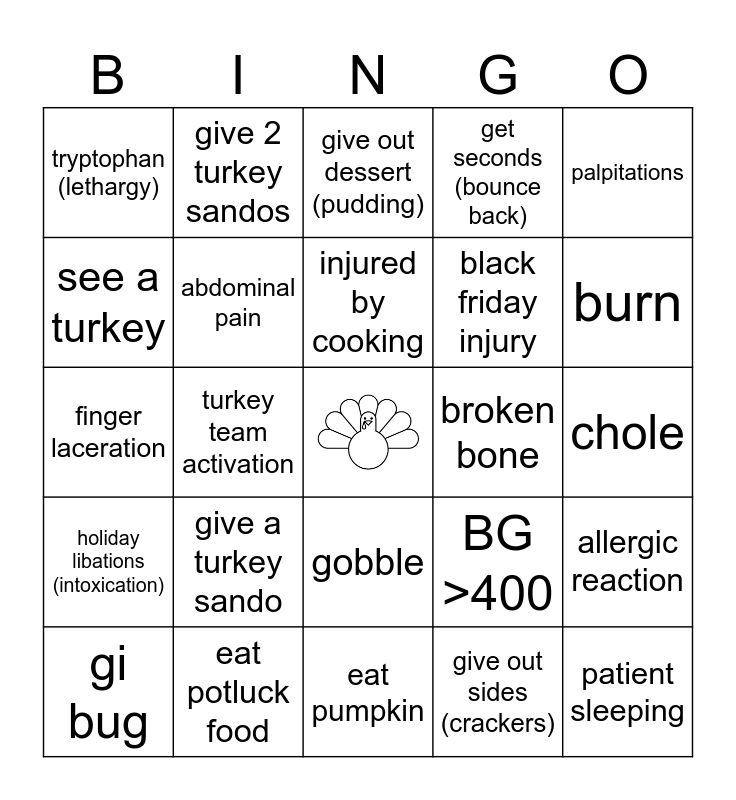 This bingo card has a free space and 24 words: give a turkey sando, eat potluck food, injured by cooking, gi bug, palpitations, tryptophan (lethargy), see a turkey, give 2 turkey sandos, broken bone, gobble, black friday injury, finger laceration, BG >400, allergic reaction, abdominal pain, give out sides (crackers), chole, give out dessert (pudding), burn, turkey team activation, patient sleeping, holiday libations (intoxication), get seconds (bounce back) and eat pumpkin.
