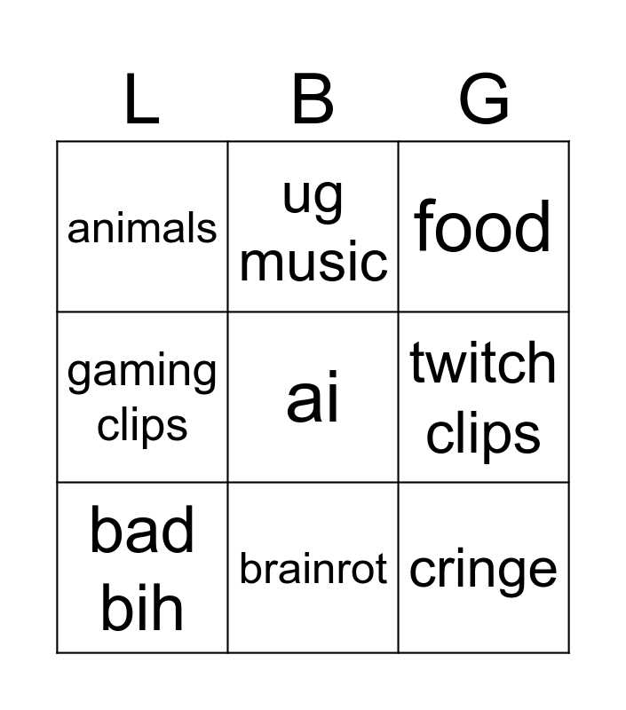 This bingo card has a free space and 8 words: twitch clips, food, ug music, bad bih, animals, cringe, gaming clips and brainrot.