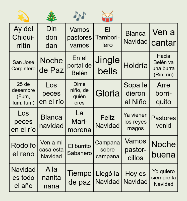 This bingo card has 36 words: Campana sobre campana, El burrito Sabanero, Llegó la Navidad, San José Carpintero, Los peces en el río, Gloria, Noche de Paz, Tiempo de paz, Blanca Navidad, Vamos pastor-cillos, Hacia Belén va una burra (Rin, rin), El Tambori-lero, Noche buena, Los peces en el río, Jingle bells, Ay del Chiqui-rritín, Rodolfo el reno, Sopa le dieron al Niño, 25 de desembre (Fum, fum, fum), Vamos pastores vamos, Dime niño, de quién eres, Blanca navidad, Feliz Navidad, La Mari-morena, Ya vienen los reyes magos, Din don dan, Holdría, A la nanita nana, En el portal de Belén, Ven a cantar, Yo quiero siempre la Navidad, Navidad es todo el año, Pastores venid, Arre borri-quito, Ven a mi casa esta Navidad and Hoy es Navidad.