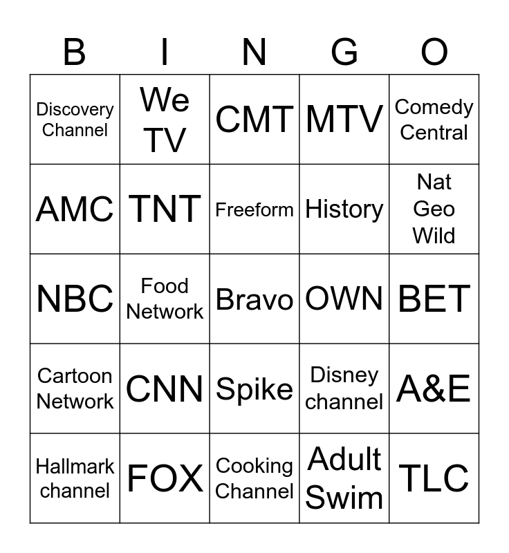 This bingo card has 40 words: ABC, NBC, USA, TNT, FOX, Spike, Freeform, TV Land, Comedy Central, Cartoon Network, Food Network, MTV, Bravo, BET, OWN, CNN, Game Show Network, Discovery Channel, Travel Channel, CMT, A&E, Adult Swim, History, AMC, TBS, Animal Planet, E!, Lifetime, TLC, HGTV, PBS, Hallmark channel, Nickelodeon, Disney channel, Nat Geo Wild, Cooking Channel, Ion Life, Oxygen, We TV and Viceland.