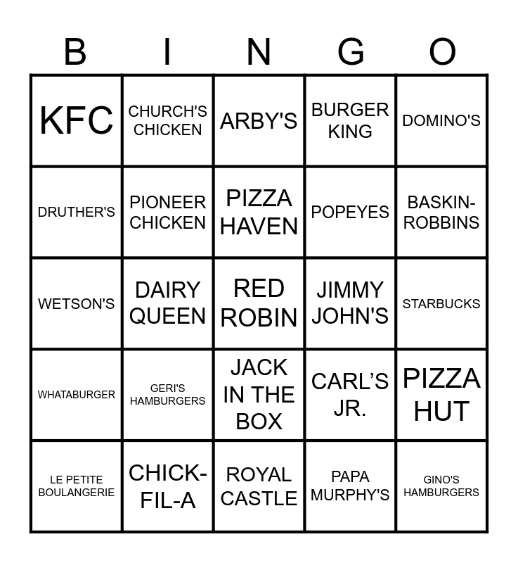 This bingo card has a free space and 69 words: MCDONALD'S, STARBUCKS, TACO BELL, SUBWAY, CHICK-FIL-A, WENDY'S, BURGER KING, DUNKIN, DOMINO'S, PANERA BREAD, PIZZA HUT, SONIC DRIVE-IN, KFC, ARBY'S, LITTLE CAESARS, DAIRY QUEEN, JACK IN THE BOX, POPEYES, PAPA JOHN'S, WHATABURGER, JIMMY JOHN'S, CARL’S JR., BASKIN-ROBBINS, WINGSTOP, RAISING CANE'S, STEAK 'N' SHAKE, EL POLLO LOCO, FIREHOUSE SUBS, PAPA MURPHY'S, AUNTIE ANNE'S, CHURCH'S CHICKEN, MARCO'S PIZZA, AMECHE'S DRIVE-IN, BURGER CHEF, BURGER QUEEN, CHICKEN GEORGE, D'LITES, DEE'S DRIVE-IN, DRUTHER'S, FARRELL'S ICE CREAM PARLOUR, GERI'S HAMBURGERS, GINO'S HAMBURGERS, HORN & HARDART, HOWARD JOHNSON'S, KENNY ROGERS ROASTERS, LE PETITE BOULANGERIE, LITTLE TAVERN, LUM'S, MIGHTY CASEY'S, PIONEER CHICKEN, PIZZA HAVEN, PUP 'N'TACO, RED BARN, ROYAL CASTLE, SANDY'S, SHOWBIZ PIZZA PLACE, STEAK & ALE, TWO PESOS, WAG'S, WETSON'S, WHITE TOWER HAMBURGER, WINKY'S, YANKEE DOODLE DANDY, RAX, PIETROS PIZZA, ALL STAR CAFE, BEEFSTEAK CHARLIES, CASA BONITA and CHI-CHI'S.