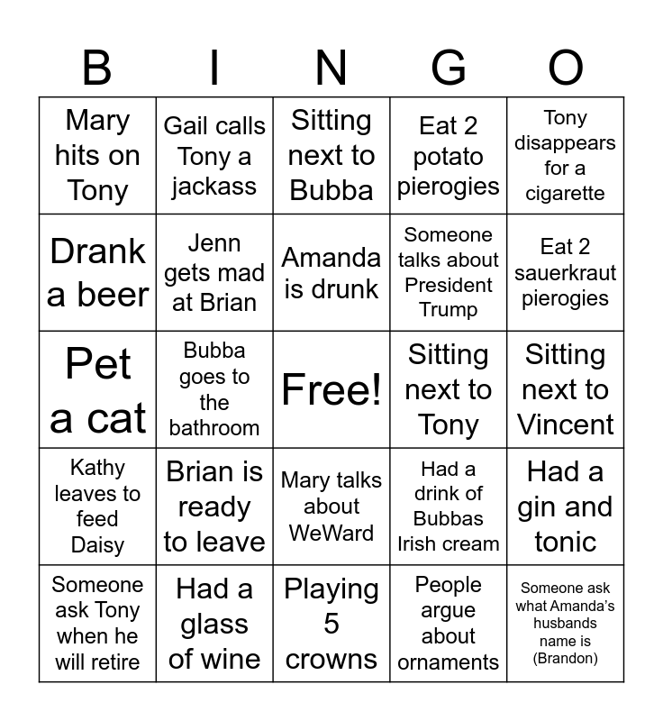 This bingo card has a free space and 24 words: Someone ask Tony when he will retire, Brian is ready to leave, Amanda is drunk, People argue about ornaments, Tony disappears for a cigarette, Mary hits on Tony, Gail calls Tony a jackass, Sitting next to Bubba, Sitting next to Tony, Sitting next to Vincent, Pet a cat, Jenn gets mad at Brian, Had a drink of Bubbas Irish cream, Had a gin and tonic, Drank a beer, Had a glass of wine, Playing 5 crowns, Eat 2 potato pierogies, Eat 2 sauerkraut pierogies, Kathy leaves to feed Daisy, Bubba goes to the bathroom, Mary talks about WeWard, Someone talks about President Trump and Someone ask what Amanda’s husbands name is (Brandon).