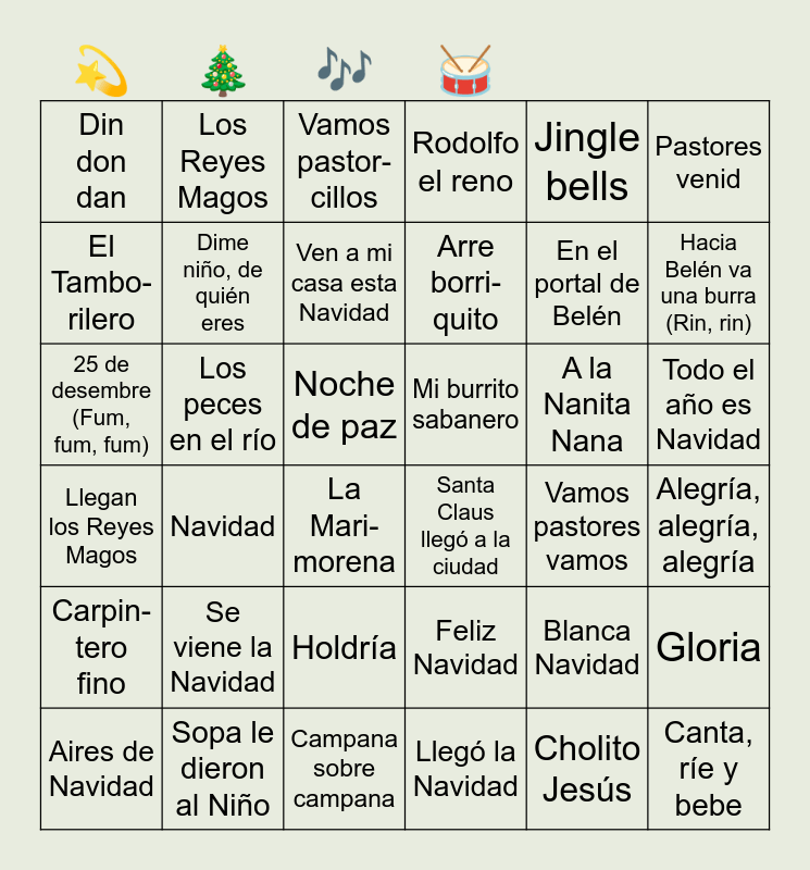 This bingo card has 36 words: Feliz Navidad, Holdría, Llegó la Navidad, El Tambo-rilero, Llegan los Reyes Magos, Mi burrito sabanero, Dime niño, de quién eres, Campana sobre campana, Jingle bells, Blanca Navidad, Hacia Belén va una burra (Rin, rin), Rodolfo el reno, Gloria, Los peces en el río, Arre borri-quito, Din don dan, Carpin-tero fino, A la Nanita Nana, 25 de desembre (Fum, fum, fum), Vamos pastor-cillos, Noche de paz, Navidad, Santa Claus llegó a la ciudad, La Mari-morena, Vamos pastores vamos, Los Reyes Magos, En el portal de Belén, Sopa le dieron al Niño, Ven a mi casa esta Navidad, Pastores venid, Canta, ríe y bebe, Aires de Navidad, Alegría, alegría, alegría, Todo el año es Navidad, Se viene la Navidad and Cholito Jesús.