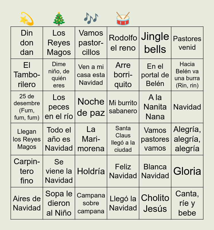 This bingo card has 36 words: Feliz Navidad, Holdría, Llegó la Navidad, El Tambo-rilero, Llegan los Reyes Magos, Mi burrito sabanero, Dime niño, de quién eres, Campana sobre campana, Jingle bells, Blanca Navidad, Hacia Belén va una burra (Rin, rin), Rodolfo el reno, Gloria, Los peces en el río, Arre borri-quito, Din don dan, Carpin-tero fino, A la Nanita Nana, 25 de desembre (Fum, fum, fum), Vamos pastor-cillos, Noche de paz, Todo el año es Navidad, Santa Claus llegó a la ciudad, La Mari-morena, Vamos pastores vamos, Los Reyes Magos, En el portal de Belén, Sopa le dieron al Niño, Ven a mi casa esta Navidad, Pastores venid, Canta, ríe y bebe, Aires de Navidad, Alegría, alegría, alegría, Navidad, Se viene la Navidad and Cholito Jesús.