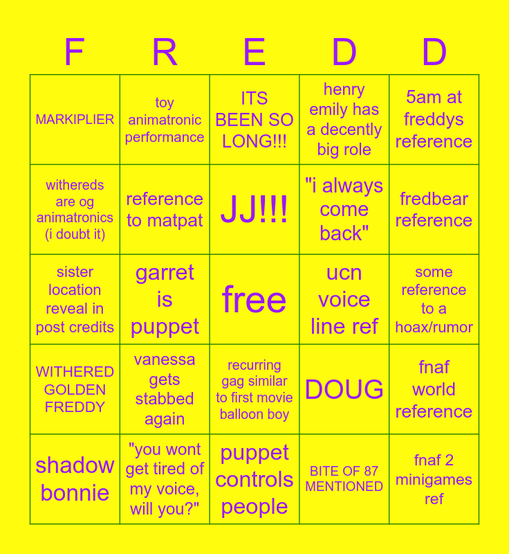 This bingo card has a free space and 24 words: vanessa gets stabbed again, "you wont get tired of my voice, will you?", JJ!!!, shadow bonnie, 5am at freddys reference, MARKIPLIER, withereds are og animatronics (i doubt it), toy animatronic performance, ucn voice line ref, recurring gag similar to first movie balloon boy, "i always come back", sister location reveal in post credits, DOUG, fnaf world reference, reference to matpat, BITE OF 87 MENTIONED, some reference to a hoax/rumor, ITS BEEN SO LONG!!!, fredbear reference, garret is puppet, fnaf 2 minigames ref, WITHERED GOLDEN FREDDY, henry emily has a decently big role and puppet controls people.