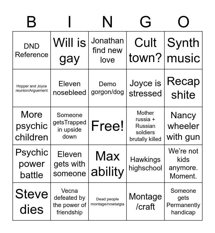 This bingo card has a free space and 24 words: Eleven gets with someone, Vecna defeated by the power of friendship, Demo gorgon/dog, Steve dies, Synth music, DND Reference, Hopper and Joyce reunion/Arguement, Will is gay, Mother russia + Russian soldiers brutally killed, Max ability, Joyce is stressed, More psychic children, Hawkings highschool, We’re not kids anymore. Moment., Eleven nosebleed, Montage /craft, Nancy wheeler with gun, Jonathan find new love, Recap shite, Someone getsTrapped in upside down, Someone gets Permanently handicap, Psychic power battle, Cult town? and Dead people montage/nowtalgia.