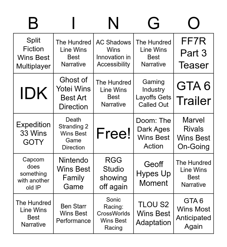 This bingo card has a free space and 29 words: The Hundred Line Wins Best Narrative, Expedition 33 Wins Best RPG, Death Stranding 2 Wins Best Game Direction, Lost Records Wins Games for Impact, Split Fiction Wins Best Multiplayer, AC Shadows Wins Innovation in Accessibility, Ghost of Yotei Wins Best Art Direction, Nintendo Wins Best Family Game, Doom: The Dark Ages Wins Best Action, Ben Starr Wins Best Performance, Marvel Rivals Wins Best On-Going, GTA 6 Wins Most Anticipated Again, Sonic Racing: CrossWorlds Wins Best Racing, TLOU S2 Wins Best Adaptation, GTA 6 Trailer, OD Trailer, RGG Studio showing off again, Capcom does something with another old IP, FF7R Part 3 Teaser, Expedition 33 Wins GOTY, Geoff Hypes Up Moment, Geoff trolls using Sid: The Science Kid, Gaming Industry Layoffs Gets Called Out, IDK, The Hundred Line Wins Best Narrative, The Hundred Line Wins Best Narrative, The Hundred Line Wins Best Narrative, The Hundred Line Wins Best Narrative and The Hundred Line Wins Best Narrative.