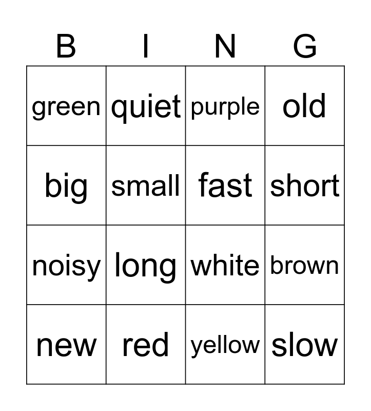 This bingo card has 16 words: red, brown, purple, green, noisy, quiet, white, yellow, big, small, new, old, long, short, fast and slow.