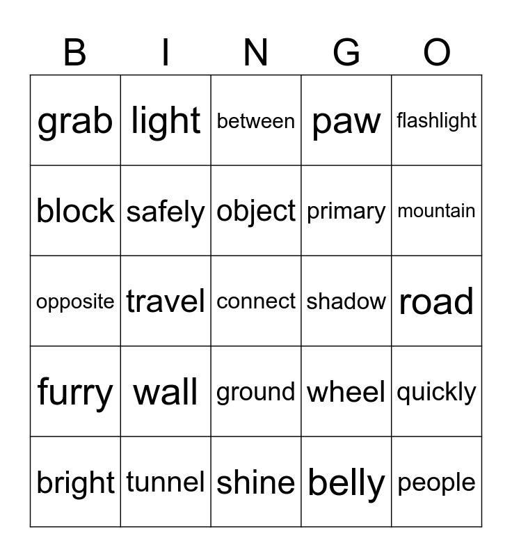 This bingo card has 25 words: wall, shine, object, bright, flashlight, grab, block, light, shadow, ground, primary, opposite, wheel, quickly, safely, people, road, between, mountain, travel, connect, tunnel, furry, paw and belly.