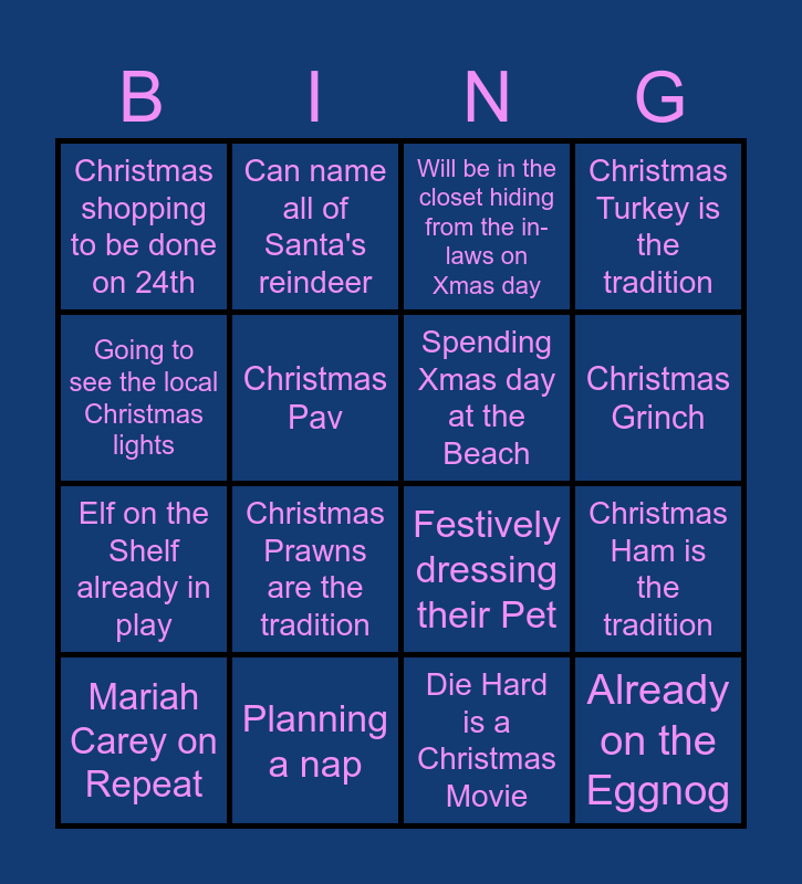 This bingo card has 16 words: Planning a nap, Christmas Ham is the tradition, Will be in the closet hiding from the in-laws on Xmas day, Christmas shopping to be done on 24th, Elf on the Shelf already in play, Can name all of Santa's reindeer, Festively dressing their Pet, Die Hard is a Christmas Movie, Going to see the local Christmas lights, Christmas Pav, Mariah Carey on Repeat, Christmas Turkey is the tradition, Christmas Prawns are the tradition, Christmas Grinch, Spending Xmas day at the Beach and Already on the Eggnog.