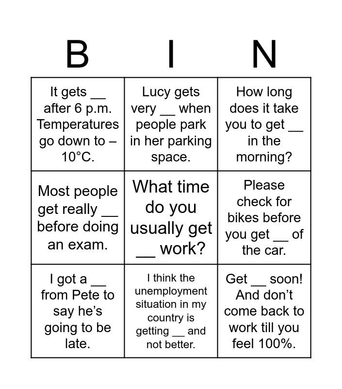 This bingo card has a free space and 8 words: Please check for bikes before you get __ of the car., How long does it take you to get __ in the morning?, Lucy gets very __ when people park in her parking space., I got a __ from Pete to say he’s going to be late., It gets __ after 6 p.m. Temperatures go down to –10°C., Get __ soon! And don’t come back to work till you feel 100%., Most people get really __ before doing an exam. and I think the unemployment situation in my country is getting __ and not better..