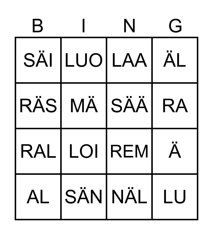 This bingo card has 16 words: AL, SÄN, LAA, ÄL, RÄS, LUO, REM, Ä, SÄI, MÄ, NÄL, RA, RAL, LOI, SÄÄ and LU.