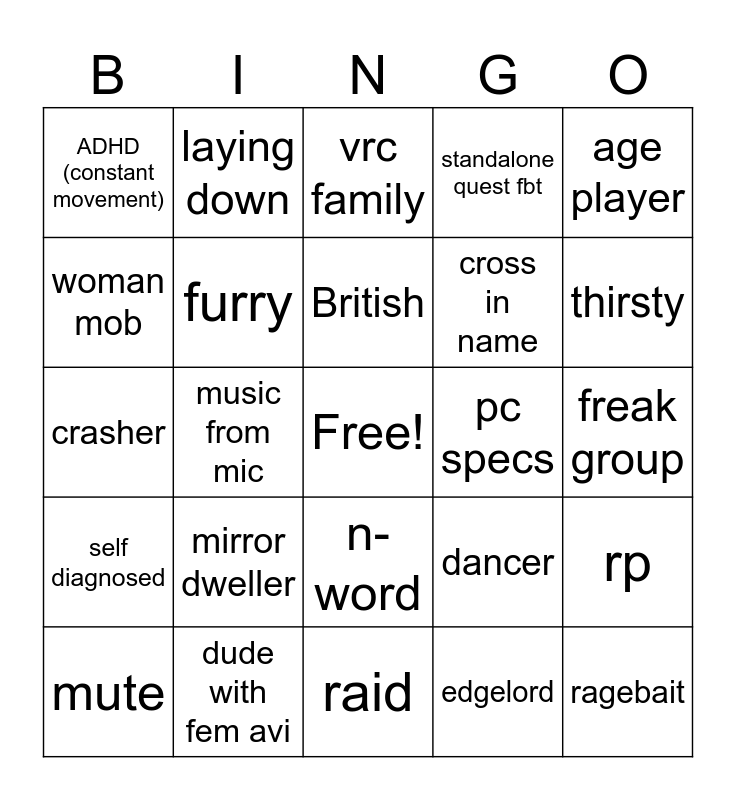 This bingo card has a free space and 39 words: bunni/ bun/ bunny, e-boy/ e-girl, forcing voice, furry, mute, n-word, British, child, age player, self diagnosed, music from mic, standalone quest fbt, ragebait, freak group, pc specs, mirror dweller, substance, ADHD (constant movement), animal name, dancer, woman mob, raid, cross in name, thirsty, soundboard, big avi, long bio, white knighting, nerd voice, laying down, phantom anything, parents irl, vrc family, dude with fem avi, edgelord, "turn on my avi", rp, crasher and abuse of power.