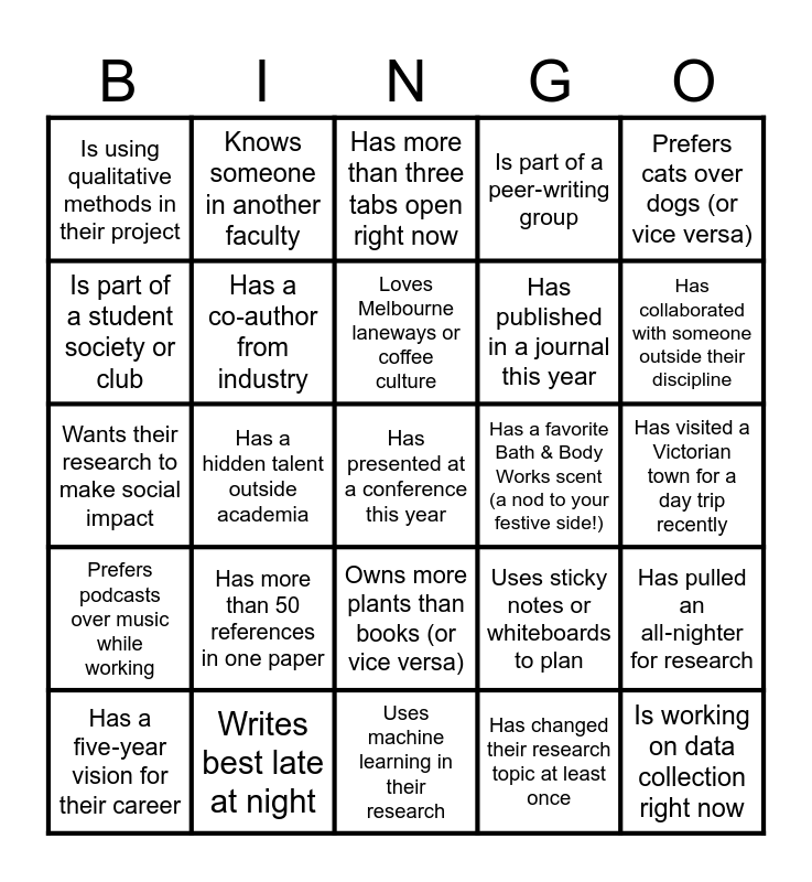 This bingo card has 52 words: Free!, Has presented at a conference this year, Is writing a thesis chapter right now, Uses machine learning in their research, Has more than 50 references in one paper, Has supervised or mentored another student, Knows someone in another faculty, Has collaborated internationally, Is part of a student society or club, Has attended an HDR social event before, Has a co‑author from industry, Drinks more than 2 coffees a day, Has pulled an all‑nighter for research, Uses sticky notes or whiteboards to plan, Has lost data due to a tech glitch, Works in the library more than the office, Loves Melbourne laneways or coffee culture, Has a favorite Bath & Body Works scent (a nod to your festive side!), Has traveled to a Victorian town recently, Prefers cats over dogs (or vice versa), Has a hidden talent outside academia, Has changed their research topic at least once, Is using qualitative methods in their project, Has published in a journal this year, Has presented a poster at a conference, Is working on data collection right now, Has cited more than 100 sources in their thesis, Uses EndNote, Zotero, or another reference manager daily, Has collaborated with someone outside their discipline, Knows a staff member from another faculty, Has attended a research showcase or symposium, Is part of a peer‑writing group, Has joined a professional association related to their field, Has a mentor outside the university, Survives on tea instead of coffee, Has more than three tabs open right now, Writes best late at night, Has had a thesis draft crash due to Word/LaTeX issues, Uses sticky notes or Trello for planning, Has a favorite study snack always on hand, Loves Melbourne’s laneways or street art, Has visited a Victorian town for a day trip recently, Prefers podcasts over music while working, Has a favorite Bath & Body Works holiday scent, Owns more plants than books (or vice versa), Has a hidden talent (singing, cooking, gaming, etc.), Loves penguins or has visited a wildlife reserve, Wants their research to make social impact, Has imagined their thesis as a TED Talk, Is excited about AI’s role in their field, Has a five‑year vision for their career and Has written a gratitude note to a supervisor or peer.