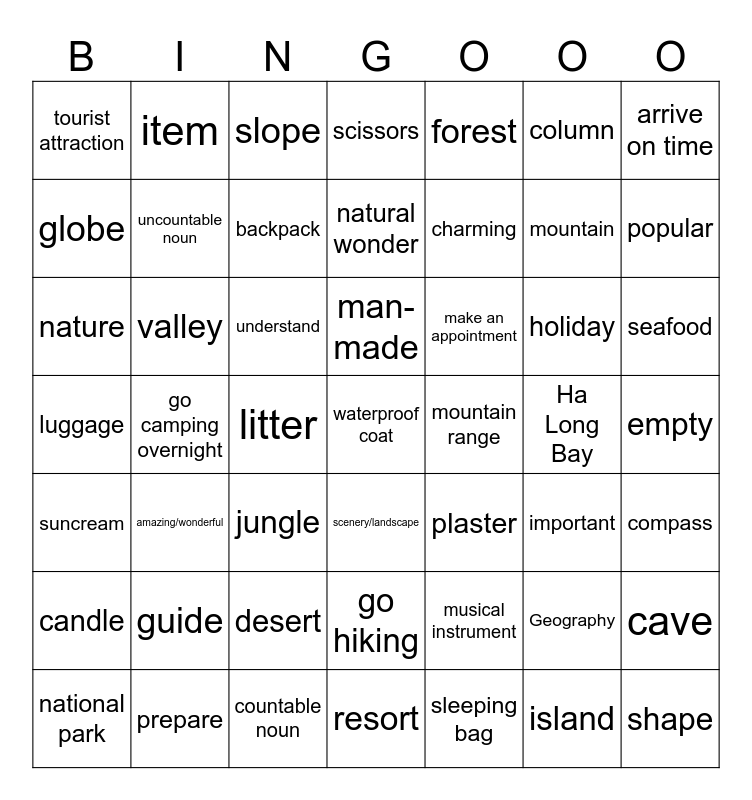 This bingo card has 49 words: Geography, mountain, sleeping bag, go camping overnight, understand, empty, item, countable noun, column, scenery/landscape, arrive on time, scissors, holiday, make an appointment, guide, Ha Long Bay, globe, popular, cave, forest, charming, litter, tourist attraction, uncountable noun, national park, backpack, seafood, prepare, man-made, valley, shape, mountain range, candle, desert, luggage, plaster, important, compass, nature, jungle, go hiking, suncream, waterproof coat, resort, natural wonder, slope, musical instrument, amazing/wonderful and island.