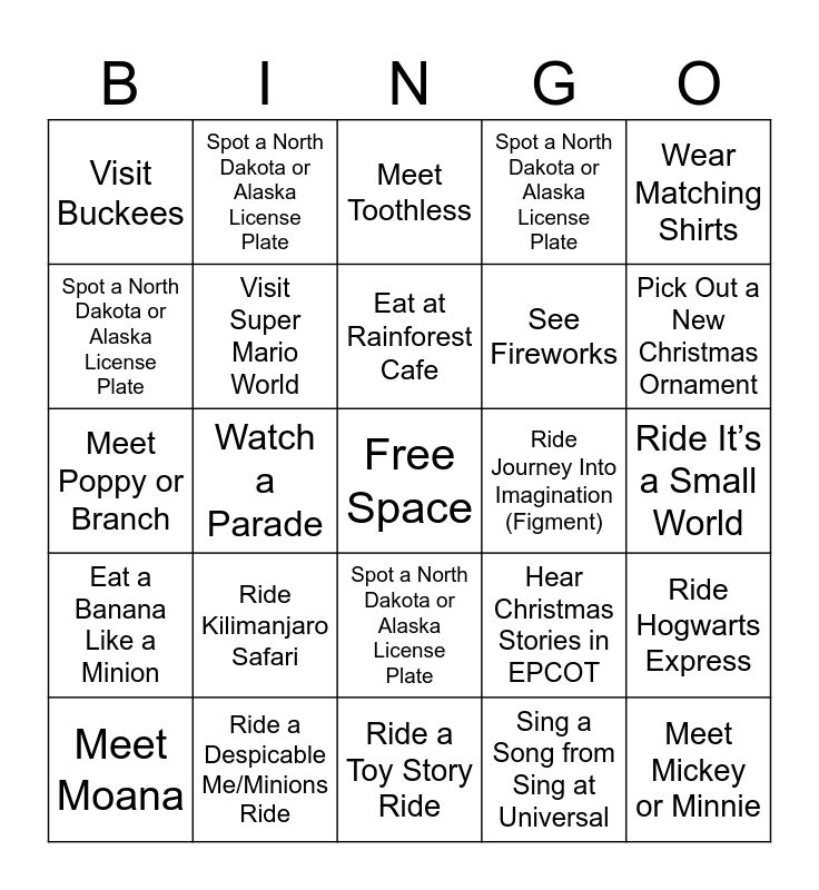 This bingo card has a free space and 29 words: Spot a North Dakota or Alaska License Plate, Ride a Despicable Me/Minions Ride, Meet Toothless, See Cinderella’s Castle, Wear Matching Shirts, Visit Buckees, Visit Super Mario World, Eat at Rainforest Cafe, Ride Journey Into Imagination (Figment), Ride Hogwarts Express, Meet Moana, Watch a Parade, Sing a Song from Sing at Universal, Meet Mickey or Minnie, Meet Poppy or Branch, Eat at a Character Dining Experience, Ride a Toy Story Ride, Hear Christmas Stories in EPCOT, Pick Out a New Christmas Ornament, Eat a Banana Like a Minion, Ride Kilimanjaro Safari, Draw or Color in the Car, See Fireworks, Ride It’s a Small World, Spot a North Dakota or Alaska License Plate, Spot a North Dakota or Alaska License Plate, Spot a North Dakota or Alaska License Plate, Spot a North Dakota or Alaska License Plate and Spot a North Dakota or Alaska License Plate.