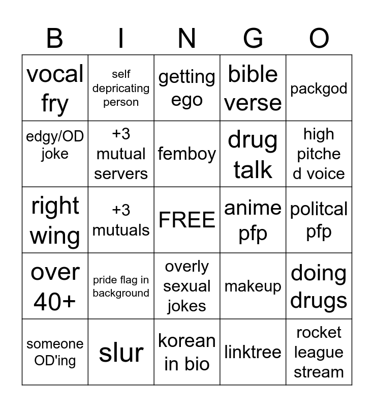 This bingo card has a free space and 24 words: pride flag in background, slur, femboy, someone OD'ing, packgod, vocal fry, edgy/OD joke, self depricating person, anime pfp, overly sexual jokes, drug talk, right wing, makeup, doing drugs, +3 mutual servers, linktree, politcal pfp, getting ego, high pitche d voice, +3 mutuals, rocket league stream, over 40+, bible verse and korean in bio.
