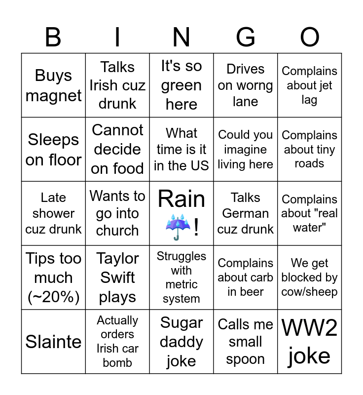 This bingo card has a free space and 24 words: Taylor Swift plays, Actually orders Irish car bomb, What time is it in the US, Slainte, Complains about jet lag, Buys magnet, Sleeps on floor, Talks Irish cuz drunk, Talks German cuz drunk, Struggles with metric system, Could you imagine living here, Late shower cuz drunk, Complains about carb in beer, We get blocked by cow/sheep, Cannot decide on food, Calls me small spoon, Complains about "real water", It's so green here, Complains about tiny roads, Wants to go into church, WW2 joke, Tips too much (~20%), Drives on worng lane and Sugar daddy joke.
