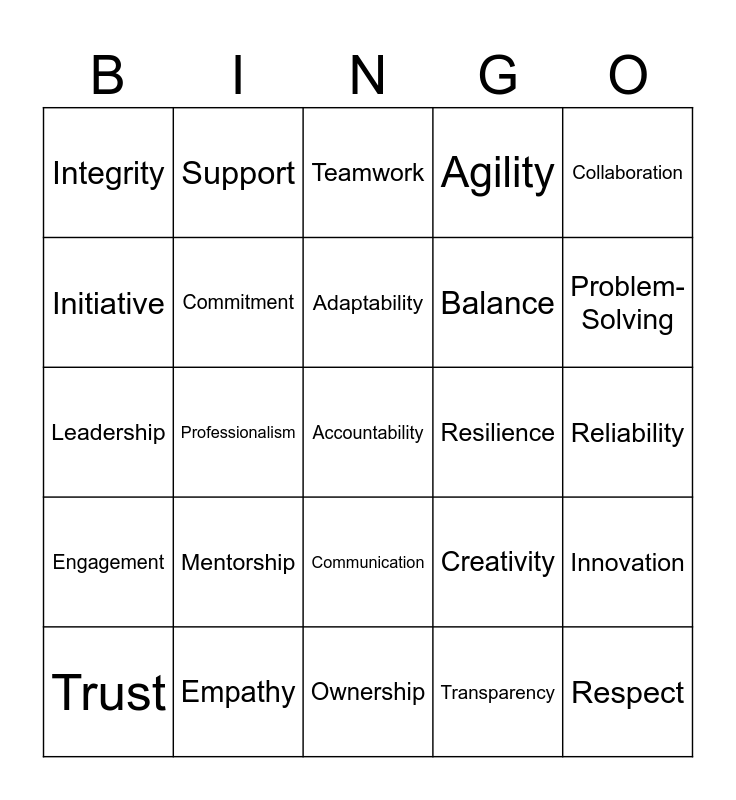 This bingo card has a free space and 24 words: Mentorship, Empathy, Adaptability, Trust, Collaboration, Integrity, Initiative, Support, Resilience, Communication, Balance, Leadership, Creativity, Innovation, Commitment, Transparency, Reliability, Teamwork, Problem-Solving, Professionalism, Respect, Engagement, Agility and Ownership.