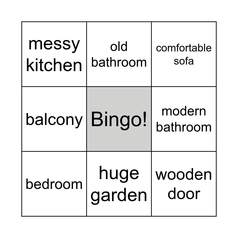 This bingo card has a free space and 16 words: wooden kitchen, antique closet, comfortable sofa, messy kitchen, dining room, old bathroom, amazing view, window, wooden door, modern bathroom, garage, balcony, ground floor, huge garden, bedroom and utility room.