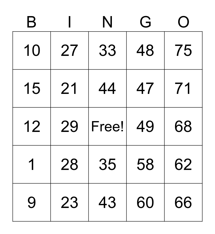 This bingo card has a free space and 24 words: 9, 28, 44, 60, 75, 10, 27, 33, 49, 68, 12, 21, 58, 62, 15, 23, 43, 48, 71, 1, 29, 35, 47 and 66.