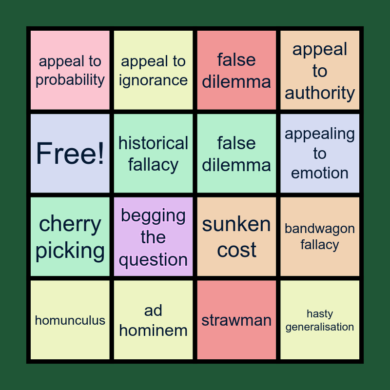 This bingo card has 16 words: ad hominem, bandwagon fallacy, false dilemma, appeal to probability, cherry picking, appeal to ignorance, sunken cost, strawman, Free!, historical fallacy, homunculus, appeal to authority, begging the question, appealing to emotion, false dilemma and hasty generalisation.