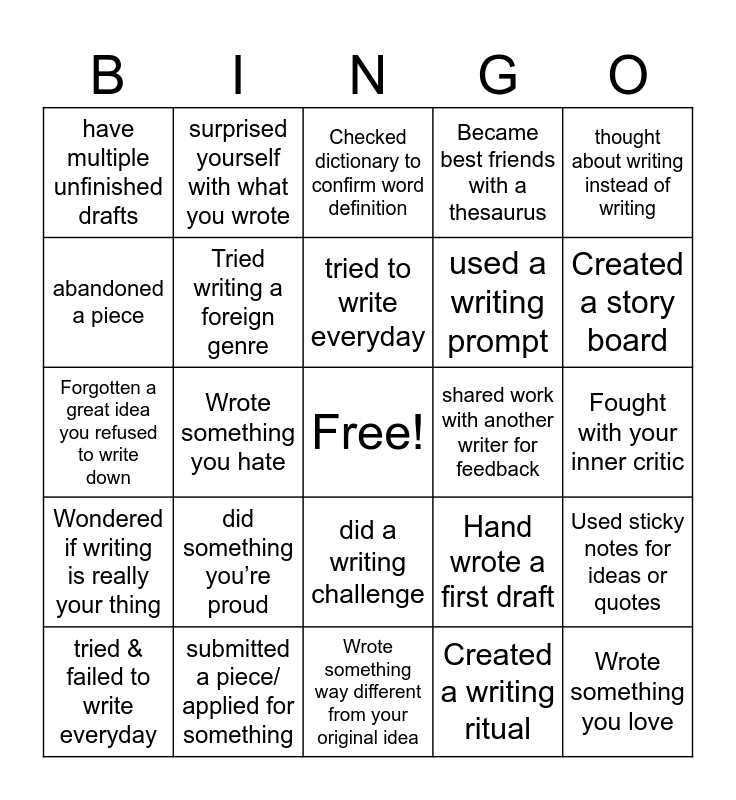 This bingo card has a free space and 24 words: did something you’re proud, submitted a piece/ applied for something, tried to write everyday, tried & failed to write everyday, thought about writing instead of writing, have multiple unfinished drafts, abandoned a piece, surprised yourself with what you wrote, shared work with another writer for feedback, did a writing challenge, used a writing prompt, Forgotten a great idea you refused to write down, Hand wrote a first draft, Used sticky notes for ideas or quotes, Tried writing a foreign genre, Created a writing ritual, Fought with your inner critic, Checked dictionary to confirm word definition, Created a story board, Wrote something you hate, Wrote something you love, Wondered if writing is really your thing, Became best friends with a thesaurus and Wrote something way different from your original idea.