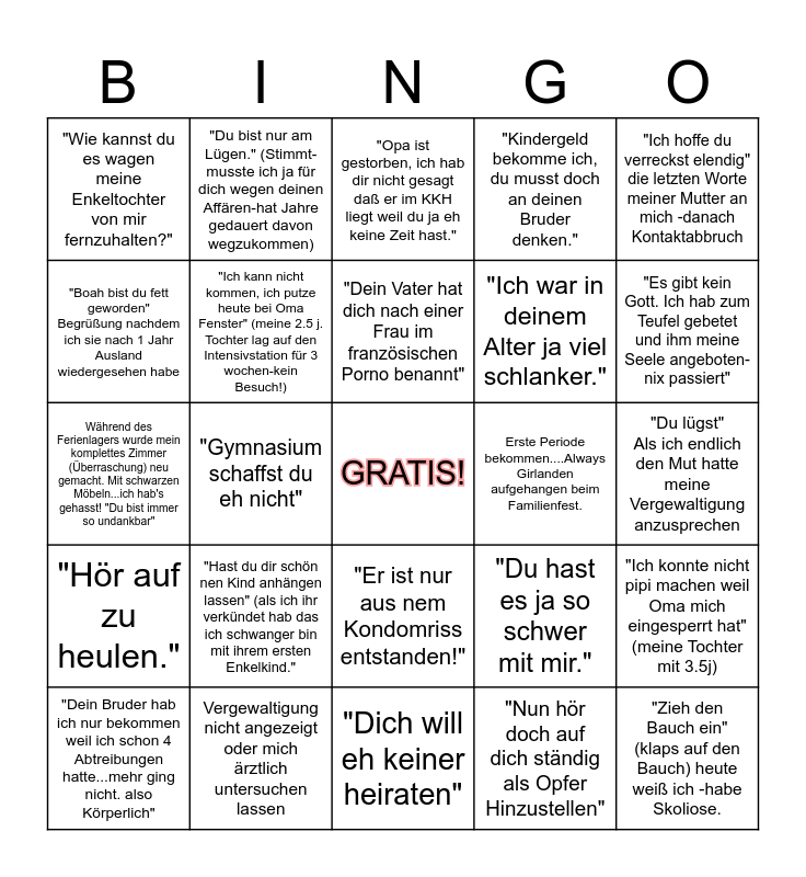 This bingo card has a free space and 24 words: "Hast du dir schön nen Kind anhängen lassen" (als ich ihr verkündet hab das ich schwanger bin mit ihrem ersten Enkelkind.", Vergewaltigung nicht angezeigt oder mich ärztlich untersuchen lassen, "Dein Vater hat dich nach einer Frau im französischen Porno benannt", "Dein Bruder hab ich nur bekommen weil ich schon 4 Abtreibungen hatte...mehr ging nicht. also Körperlich", "Ich hoffe du verreckst elendig" die letzten Worte meiner Mutter an mich -danach Kontaktabbruch, "Wie kannst du es wagen meine Enkeltochter von mir fernzuhalten?", "Boah bist du fett geworden" Begrüßung nachdem ich sie nach 1 Jahr Ausland wiedergesehen habe, "Du bist nur am Lügen." (Stimmt-musste ich ja für dich wegen deinen Affären-hat Jahre gedauert davon wegzukommen), Erste Periode bekommen....Always Girlanden aufgehangen beim Familienfest., "Er ist nur aus nem Kondomriss entstanden!", "Ich war in deinem Alter ja viel schlanker.", Während des Ferienlagers wurde mein komplettes Zimmer (Überraschung) neu gemacht. Mit schwarzen Möbeln...ich hab's gehasst! "Du bist immer so undankbar", "Du hast es ja so schwer mit mir.", "Ich konnte nicht pipi machen weil Oma mich eingesperrt hat" (meine Tochter mit 3.5j), "Ich kann nicht kommen, ich putze heute bei Oma Fenster" (meine 2.5 j. Tochter lag auf den Intensivstation für 3 wochen-kein Besuch!), "Nun hör doch auf dich ständig als Opfer Hinzustellen", "Du lügst" Als ich endlich den Mut hatte meine Vergewaltigung anzusprechen, "Opa ist gestorben, ich hab dir nicht gesagt daß er im KKH liegt weil du ja eh keine Zeit hast.", "Es gibt kein Gott. Ich hab zum Teufel gebetet und ihm meine Seele angeboten-nix passiert", "Gymnasium schaffst du eh nicht", "Zieh den Bauch ein" (klaps auf den Bauch) heute weiß ich -habe Skoliose., "Hör auf zu heulen.", "Kindergeld bekomme ich, du musst doch an deinen Bruder denken." and "Dich will eh keiner heiraten".