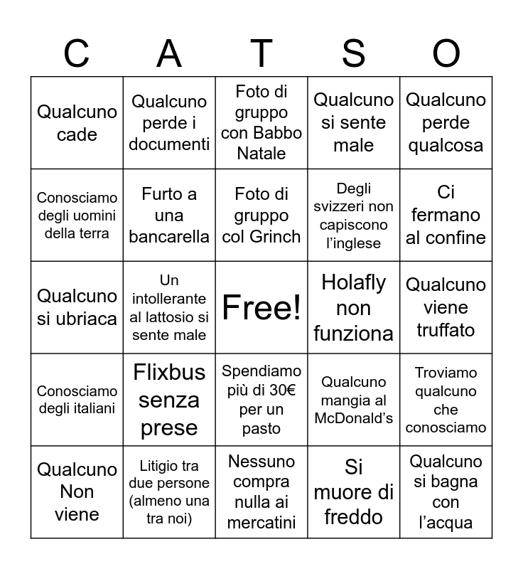 This bingo card has a free space and 29 words: Qualcuno Non viene, Qualcuno si perde, Un intollerante al lattosio si sente male, Nevica, Qualcuno cade, Foto di gruppo con Babbo Natale, Furto a una bancarella, Flixbus senza prese, Holafly non funziona, Litigio tra due persone (almeno una tra noi), Qualcuno viene truffato, Qualcuno si bagna con l’acqua, Nessuno compra nulla ai mercatini, Si muore di freddo, Ci fermano al confine, Un flixbus è in ritardo di almeno un’ora, Spendiamo più di 30€ per un pasto, Conosciamo degli italiani, Qualcuno perde qualcosa, Qualcuno si ubriaca, Qualcuno mangia al McDonald’s, Qualcuno rompe qualcosa al Cern, Degli svizzeri non capiscono l’inglese, Conosciamo degli uomini della terra, Qualcuno si sente male, Qualcuno perde i documenti, Troviamo qualcuno che conosciamo, Foto di gruppo col Grinch and Litigio per i posti sul Flixbus.