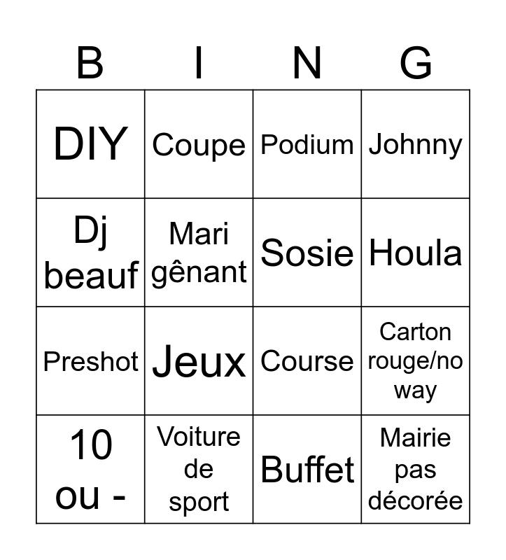 This bingo card has 16 words: Voiture de sport, Carton rouge/no way, Podium, DIY, Preshot, Coupe, Course, Buffet, Dj beauf, Mari gênant, 10 ou -, Johnny, Jeux, Houla, Sosie and Mairie pas décorée.