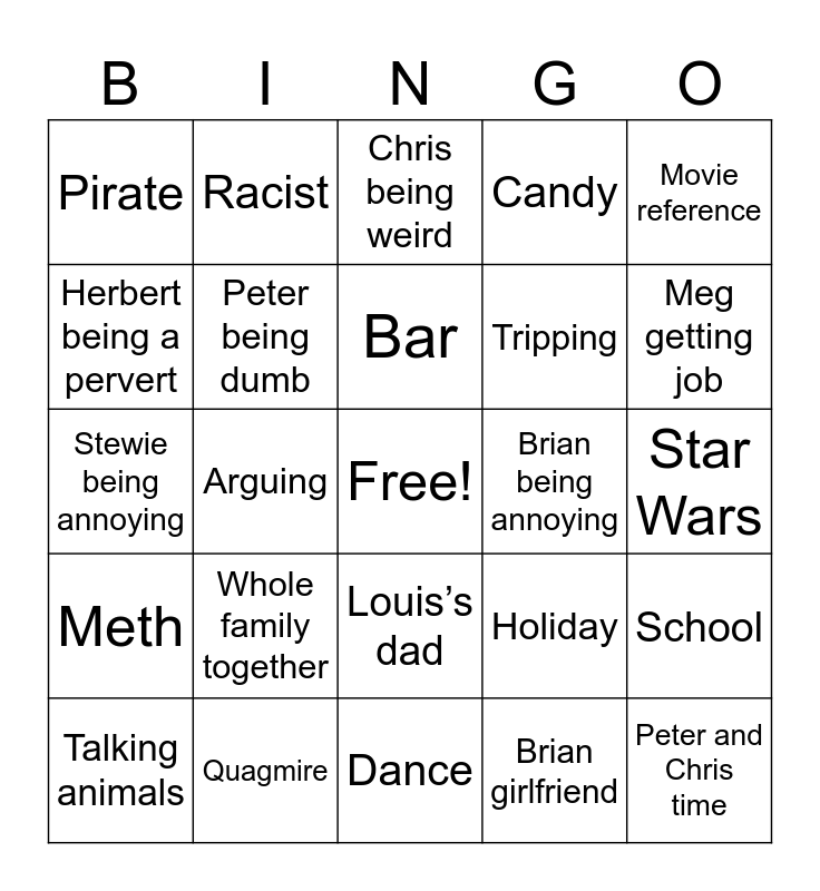 This bingo card has a free space and 24 words: Whole family together, Quagmire, Bar, Talking animals, Movie reference, Pirate, Herbert being a pervert, Racist, Brian being annoying, Louis’s dad, Tripping, Stewie being annoying, Holiday, School, Peter being dumb, Brian girlfriend, Star Wars, Chris being weird, Meg getting job, Arguing, Peter and Chris time, Meth, Candy and Dance.