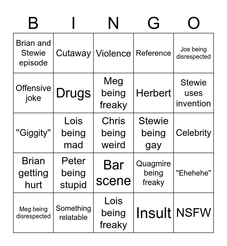 This bingo card has 25 words: Peter being stupid, Lois being freaky, Meg being freaky, Meg being disrespected, Joe being disrespected, Brian and Stewie episode, Offensive joke, Cutaway, Stewie being gay, Bar scene, Herbert, ''Giggity'', Quagmire being freaky, ''Ehehehe'', Drugs, NSFW, Celebrity, Violence, Stewie uses invention, Lois being mad, Chris being weird, Something relatable, Brian getting hurt, Reference and Insult.