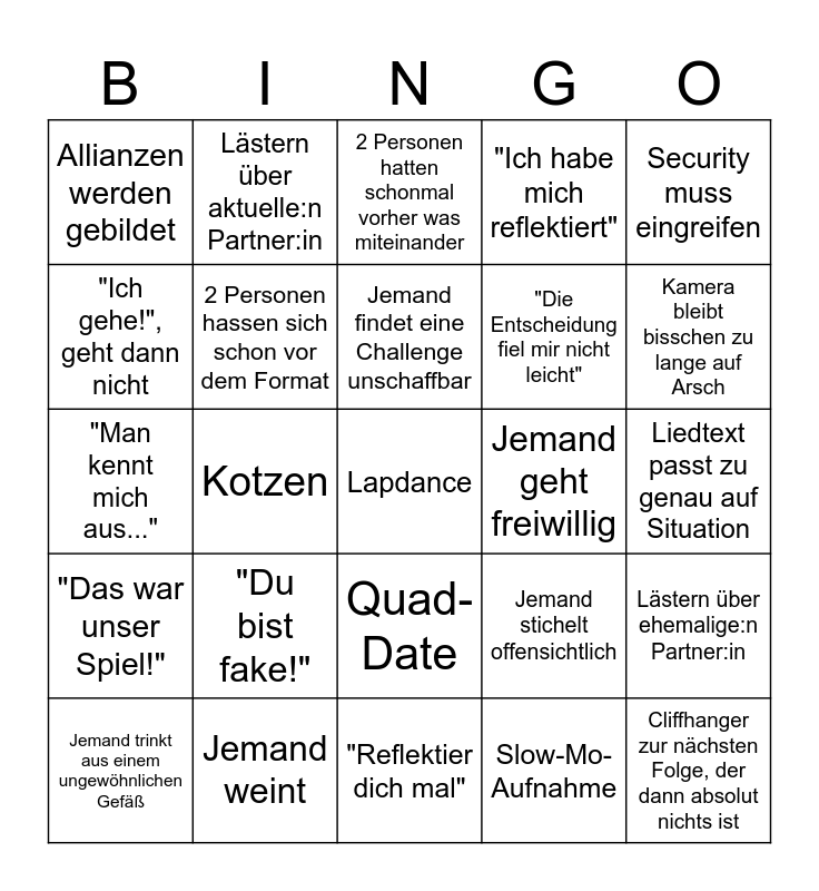 This bingo card has a free space and 29 words: Jemand trinkt aus einem ungewöhnlichen Gefäß, "Sendezeit", Kotzen, Jemand redet über Geld/Gage, Allianzen werden gebildet, 2 Personen hatten schonmal vorher was miteinander, 2 Personen hassen sich schon vor dem Format, "Du bist fake!", Jemand geht freiwillig, Jemand weint, Liedtext passt zu genau auf Situation, Cliffhanger zur nächsten Folge, der dann absolut nichts ist, "Reflektier dich mal", Slow-Mo-Aufnahme, Kamera bleibt bisschen zu lange auf Arsch, "Können wir kurz sprechen?", Quad-Date, "Das war unser Spiel!", Security muss eingreifen, "Man kennt mich aus...", Jemand stichelt offensichtlich, Off-Kamera-Moment wird gezeigt, "Die Entscheidung fiel mir nicht leicht", "Ich gehe!", geht dann nicht, "Ich habe mich reflektiert", Lästern über aktuelle:n Partner:in, Lästern über ehemalige:n Partner:in, Jemand findet eine Challenge unschaffbar and "Wer bist du überhaupt".