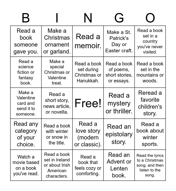 This bingo card has a free space and 24 words: Read a book with winter or snow in the title., Read a book set in Ireland or about Irish American characters., Read a book set during Christmas or Hanukkah., Watch a movie based on a book you've read., Read a book set in a country you've never visited., Read a book someone gave you., Read a science fiction or fantasy book., Make a Christmas ornament or garland., Read a mystery or thriller., Read a love story (modern or classic)., Read a book of poems, short stories, or essays., Make a Valentine card and send it to someone., Read an epistolary story., Read a book about winter sports., Make a special Christmas or Valentine treat., Read an Advent or Lenten book., Reread a favorite children's story., Read a memoir., Read a book set in the mountains or woods., Read a short story, news article, or novella., Read the lyrics to a Christmas song, and then listen to the song., Read any category of your choice., Make a St. Patrick's Day or Easter craft. and Read a book that feels cozy or comforting..