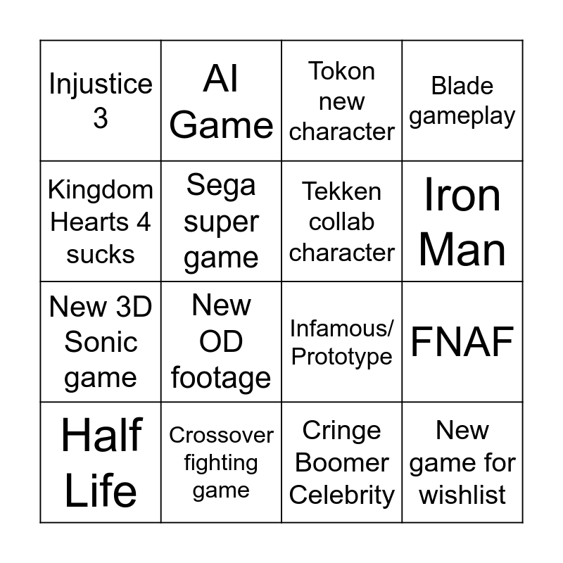 This bingo card has 16 words: Crossover fighting game, FNAF, Tokon new character, Injustice 3, New 3D Sonic game, AI Game, Infamous/ Prototype, Cringe Boomer Celebrity, Kingdom Hearts 4 sucks, Sega super game, Half Life, Blade gameplay, New OD footage, Iron Man, Tekken collab character and New game for wishlist.